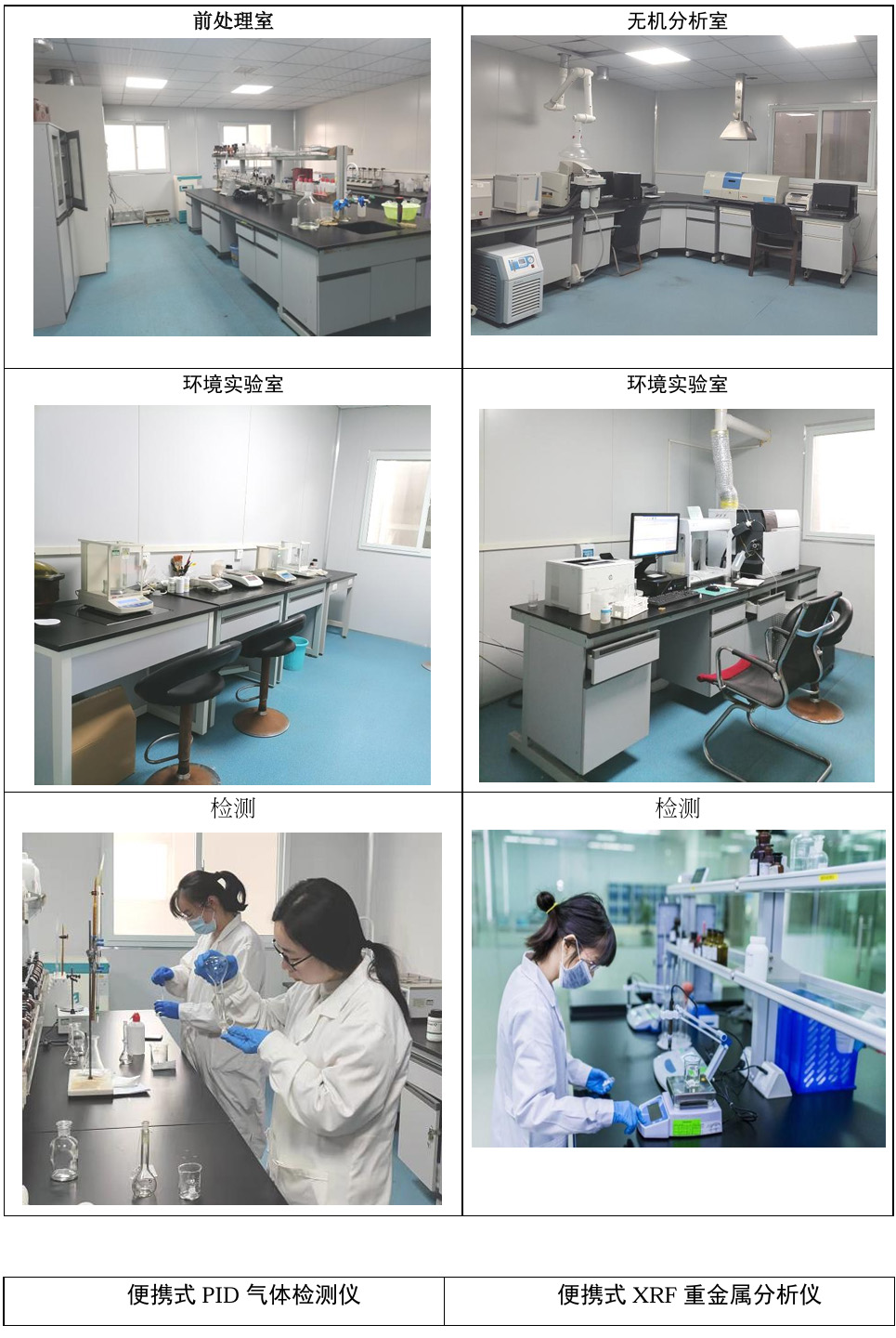 公司总部办公及检测试验场所建筑面积22亩,其中环境实验室面积2160m2。分别设 有样品制备室2个,面积共105m2;样品保存室1个,面积95m2;样品收样室1个,面积 25m2;样品风干室3个,面积共92m2;分析检测实验室20余间,面积约1500 m2,包含理 化、无机、有机前处理室、天平室、环境样品室、土壤样品留样间、土壤样品制备间、土 壤样品晾晒间、高温室、试剂室、原子吸收原子荧光室、ICP-MS室、微生物室、嗅辨室、 液相色谱室、气相色谱室、放射性检测室、仪器室、档案室等不同实验功能区。实验室保 持整洁、安全的操作环境,通风良好、布局合理,相互有干扰的监测项目不在同一实验室 内操作,测试区域与办公场所分离。